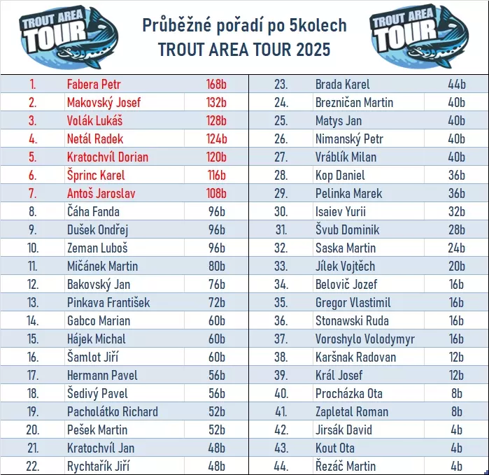 The current ranking of the Trout Area Tour 2025 series will be displayed in its current version on the website www.Trout-Area-Tour.cz