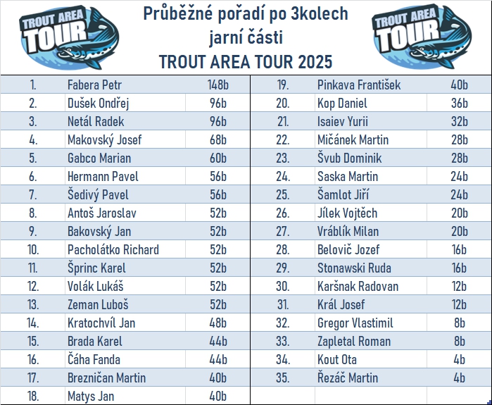 Aktuální žebříček seriálu Trout Area Tour 2025 bude v aktuální verzi zobrazen na stránkách www.Trout-Area-Tour.cz